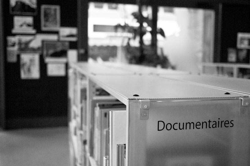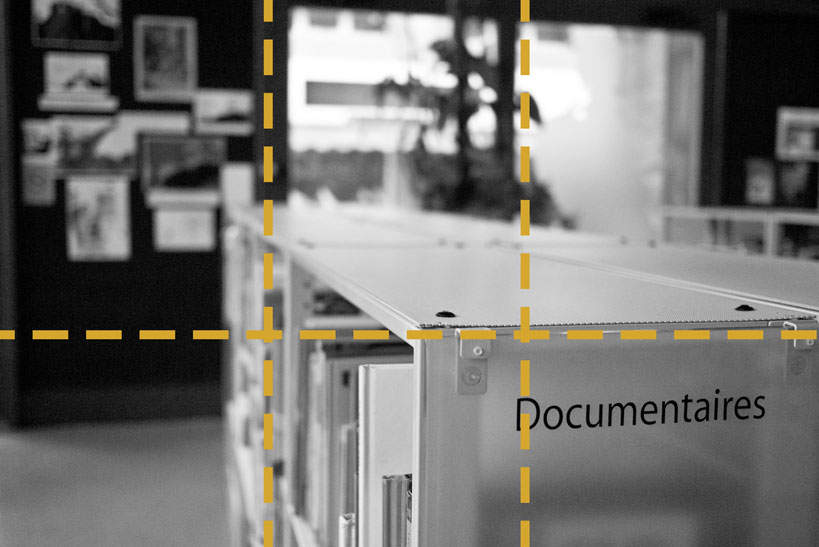 Ici, on a placé sciemment l’arête du meuble et le début du mot « Documentaires » à l’intersection des tiers bas/droit. L’effet est renforcé par la faible profondeur de champ qui guide l’œil vers la zone de netteté.